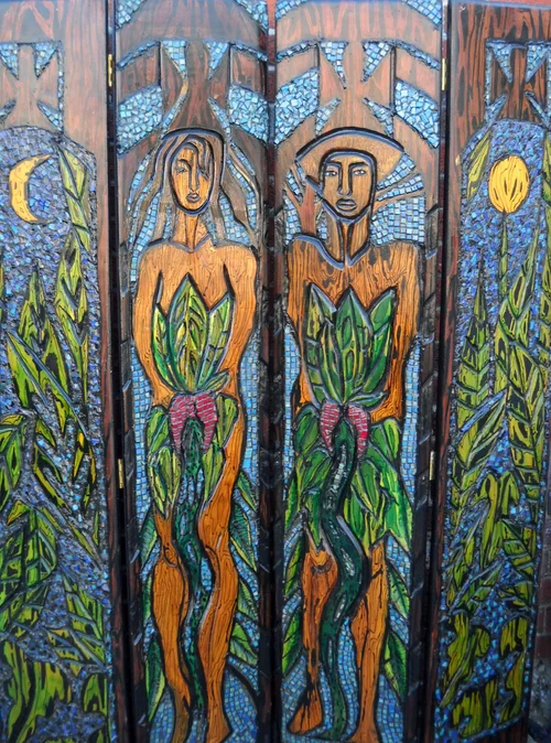 Wood Graphics is a process of staining wood with ink, relive carvings with mosaic tiles.